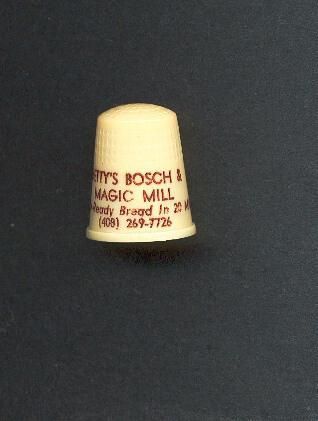 Plastic Advertising thimble, yellow with brown lettering. Advertising ÒBettyÕs Bosch & Magic Mill Oven-Ready Bread in 20 min. (408)269-77260Ó Inside apex U.S.A. 3. Waffle type knurling.