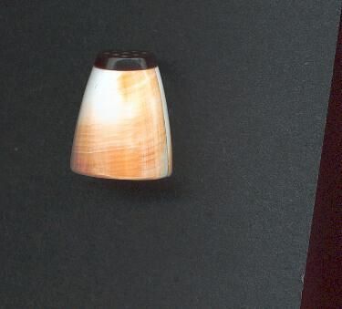 Shell thimble,tapered, white with light brown streaks. Added top is black with knurling. Seems to be made with 2 pieces, shaped and seamed.No marks.