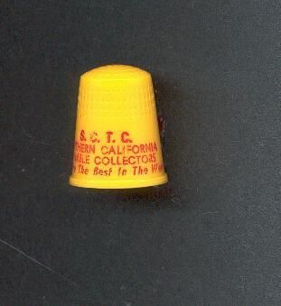 Yellow plastic Advertising thimble with red printing. Advertising :S.C.T.C. ÒSouthern California Thimble Collectors. We Are The Best in The WestÓ U.S.A.14 in apex.