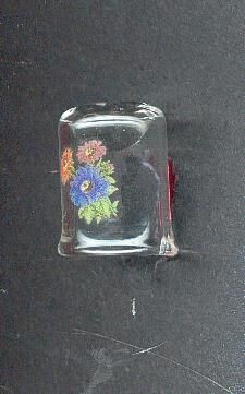 Blown glass with painted flower design on body of thimble.Blue and yellow aster type flowers with green leaves. Recessed knurled top.