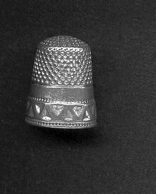 Silver thimble with wide patterned band at rim. Pattern of triangles, right side up and upside down around with a row of dots (indented) both above and below. Narrow plain band above with remains of trade mark (looks like anchor). Indentations to and over top. Slightly out of round.