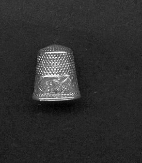 Silver thimble with raised rim and row of dots at top of rim.Wide row of pattern of ivy leaf and dots around. Knurling from pattern to and over top.Size marked in pattern. Cartouche, angled, in pattern.