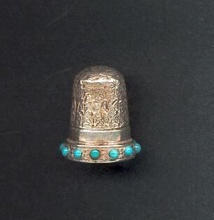 Silver thimblke. All-over chrysanthenum pattern. Raised rim with 12 spaces for stones - 1 green remaining. Narrow plain band above with makers mark CH - Charles Horner. Faint signs of hallmark - Chester?. date not readable. Stones replaced with small turquoises.