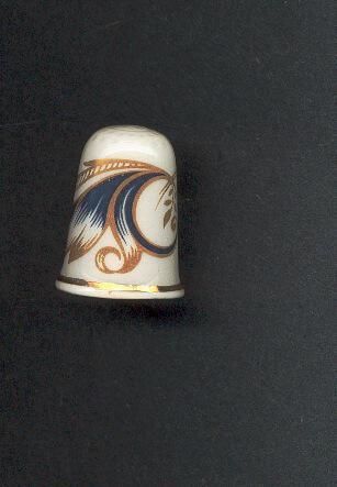 White glazed bone china thimble with modern design in black and gold on body of thimble. Slightly fluted with gold line near rim. Stamped inside Made in England.Decal.
