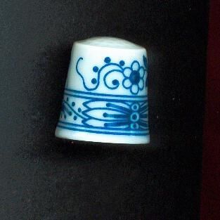 White porcelain, squat shaped thimble with blue stylized decoration. Smooth top although indentations are visible.Stamped inside with logo--L ion in oval with 1814 below and Hutschenreuther Germany.