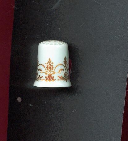 White porcelain fluted thimble. Gold decoration from rim half way up side of thimble. Knurled top.Inside ÒBernardaud Limoges FranceÓ