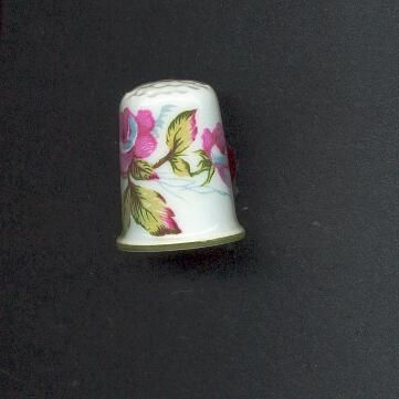 White porcelain glazed thimble, fluted at rim. Rim painted green. Design of red roses with green leaves - decal - around body of thimble. Stamped inside in blue Haviland Limoge France.