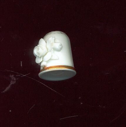 White glazed bone china thimble with hand painted gold band at rim. A handcrafted porcelain rose is on the body of the thimble. Inside stamped Bone (crown) China Coalport Made in England Est. 1750.