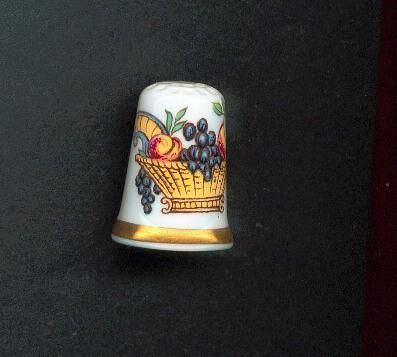 White glazed bone china, very tall, thimble with wide gold band at rim. Fruit basket - decal - pattern on thimble.Inside stamped ÒCrown Staffs EnglandÓ and ÒFruit BasketÓ.