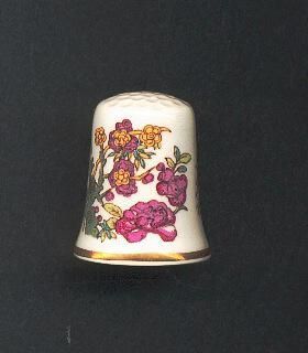 Off-white glazed slightly fluted thimble with gold band at rim. Bouquet of flowers and leaves, -decal - both front and back. Stamped inside JB Johnson Brothers Made in England Ironstone.