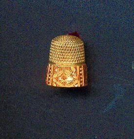 Silver squat small thimble with gold panelled band. Gold band is 1/2 thimble - incised, divided into 4 sections, one is cartouche. Cartouche has initials JB and 4(size).Sections are divided by longtitudinal strips with circles in them. Sections have a diamond with flower and feathering. Knurling to and over top. Inside SimonBros. logo