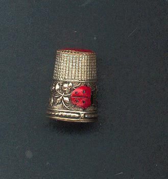 Silverplated embossed tall thimble. Wide band of pattern from rim to 1/2way up thimble. Side seamed. Pattern of a spray of flowers in silver with a red ladybug amongst them. Square knurling from band to top ,Round indentations on top. Red paper sticker with Made in Portugal in gold on top.I nside gold colour.