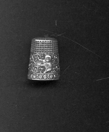 Silver plated embossed thimble from Portugal. Wide band of pattern at rim. Embossed design of kitten, and scrolls. Side seamed. Square knurling to top. Round indentations on top with deisgn in center.