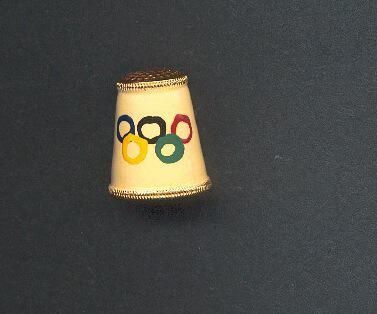 Souvenir brass painted thimble of the 1976 Olympics.Painted white over body of thimble. Red 6 petalled flower with 1976 in black underneath one side. Other side has the 5 coloured rings of the Olympics.Top knurled brass No marks.