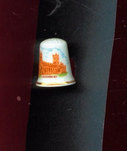 White glazed bone china Souvenir thimble. Fluted rim with narrow gold band. Decal of Canterbury Cathedral on body of thimble with the name Canterbury beneath. Inside TP Theodore Paul Fine English Bone China.