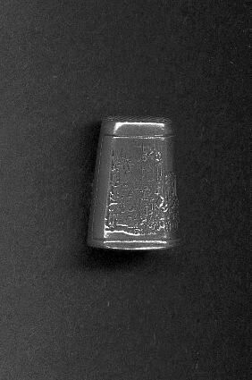 Tall polished pewter Souvenir thimble. Flat waffle indentations on top. Design of York Minster one side, other side has incised City of York. No marks.