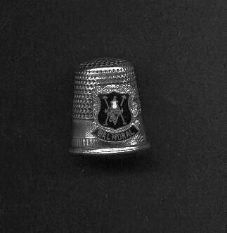 Souvenir thimble with rolled rim. Band of vertical lines above rim then a wide plain band before knurling to and over top. Applied crest in silver and blue of Victoria and Albert with Balmoral at the base.No marks.