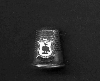 Silver coloured Souvenir thimble with rolled rim. Narrow band of vertical lines above ri m with a wide plain band above, then knurling to and over top. Added crest with symbols of Glasgow - fish, bird, trees ? and the word Glasgow below.