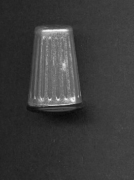 Pipe smokerÕs thimble. Thin silver coloured metal, ribbed, outside. Black plastic inside and rim. Flat top. Stamped on top ÒFalcon Tamper EnglandÓ. Stamped inside top ÒPatent Applied For 4Ó