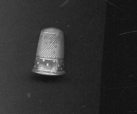 Siover thimble with rolled rim. Wide band of pattern - 3 rows of 6 petalled small flowers./ Narrow bands of vertical lines above,and below. Tall. No marks.