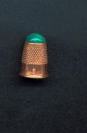 Tall brass thimble with rolled rim. Green stone - glass? - on top. Wide plain band with 2 - size - stamped on. Knurling to top. No other marks.