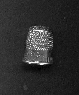 Metal, silver coloured, thimble with rolled rim. Narrow band of vertical lines above rim. Wider plain band above. Stamped *Solid Nickel Silver* and 2 (size).