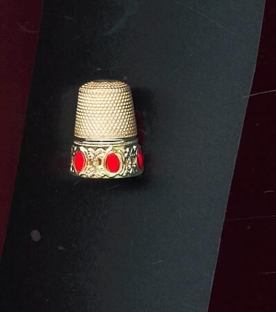 Silver thimble with decorated band sat rim. Band has 6 oval red stones around enclosed in decorative silver frames. Knurling from band to and over top. Stamped center top Ò800 (silver content) and *328F1Ó