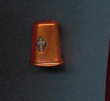 Copper thimble with rolled rim. Silver cross, small, imposed on body of thimble. Body smooth. Knurled top. No marks.