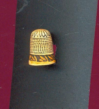 Ivorine thimble with, carved rop, knurled sides. Ivorine is powderes bone, hardened and carved. Orange pink border at rim of leaves. Knurling looks more like paint dots. Slightly fluted. No marks.