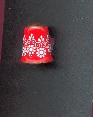 Red enamelled copper thimble with a white flower design around body of thimble. Slight fluring at rim. Top knurled. Red enamel inside with ÒAustriaÓ in white.
