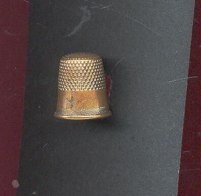 Brass thimble with thread cutter. Rolled rim. Narrow band of diagonal lines above rim. Wide plain band above with size stamped on. Thread cutter - 2 uÕs facing extends through wide plain band into diagonal lines. No makerÕs mark.