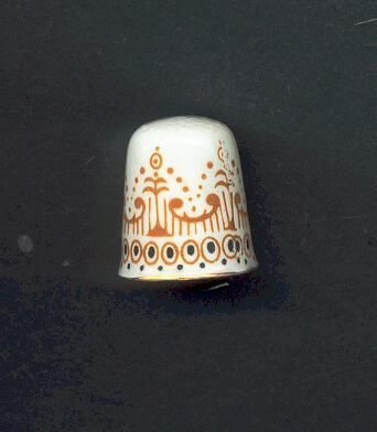 White china, fluted thimble with stylized pattern in blue and gold around body of thimble. Slight signs of knurling over top. Gold rim. Paper label inside reads India.