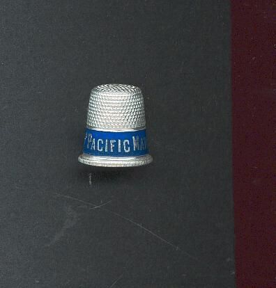 Aluminum Advertising thimble. Rolled vertical lined rim. Blue band above with advertising ÒBuy Pacific Match Co. MatchesÓ. Knurling to and over top. No Marks.