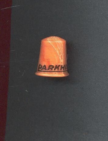 Brown early plastic Advertising thimble with rim. Dots on rim. Black printing advertising ÒParkhill Better Bedding*Ó Inside top B&B St. Paul