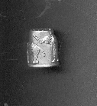 Pewter thimble with 2 elephants, trunk to tail around body of thimble. Flat knurled top. Raised rim. Inside stamped ÒCuter PewterÓ