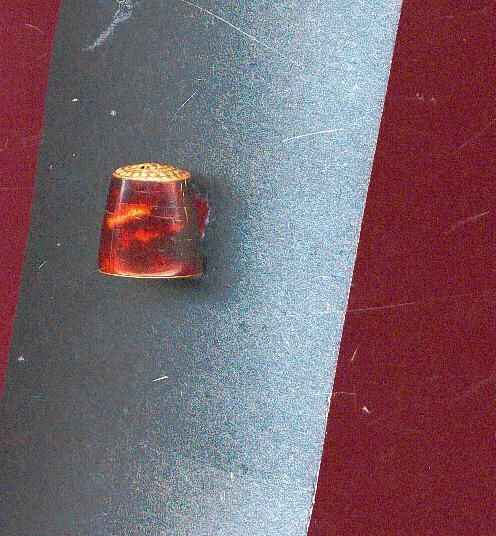 Tortoise shell thimble lined with a gold coloured metal - probably Pinchbeck (4 parts copper, `1 part zinc) Top knurled and of gold coloured metal.