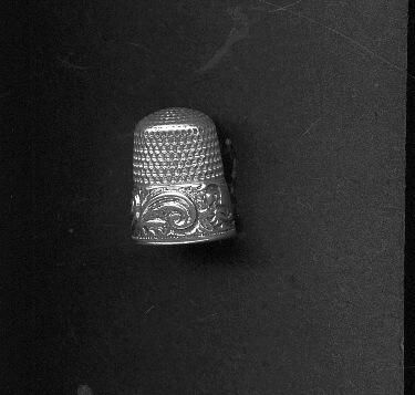 Silver thimble with wide gold band of pattern. Feathers pattern around with cartouche. Size stamped in cartouche, no name or initials. Inside apex Simon Bros logo.