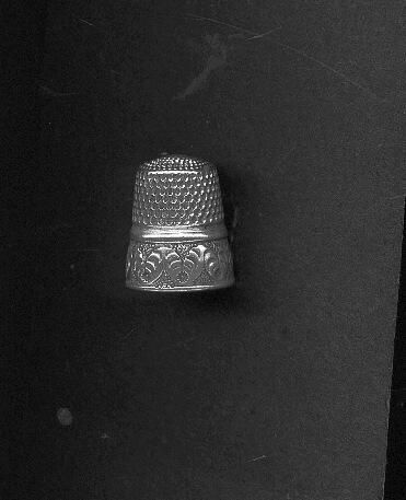 Silver thimble with wide band of design at rim.Abstract flowers with cartouche. Size on band and fouled anchor logo of Stern Bros. N.York City. Knurling to and over top.