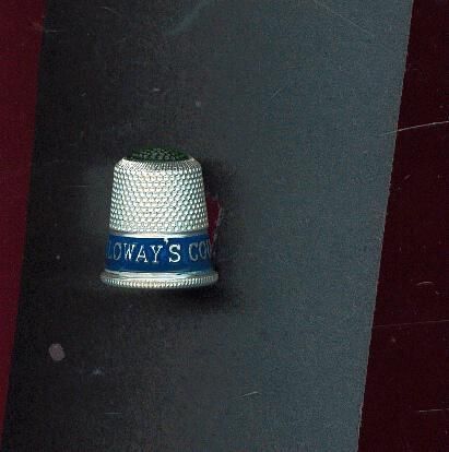Aluminum Advertising thimble with green simulated stone top. Rolled verticallly lined rim. Blue band with advertising ÒGallowayÕs Cough Syrup*Ó