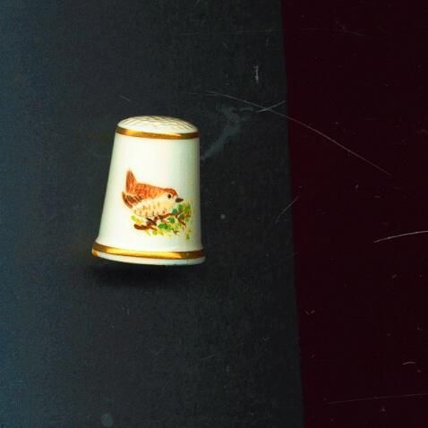 White, glazed hand painted slightly fluted bone china thimble. Gold band top and at rim. Bird - small brown wren in greenery one side,branch on other with artists signature C.Bull. Inside Royal Worcester bone china Made in England.