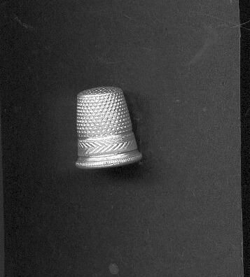 Aluminum thimble with rolled lined rim. Band of pattern - horizintal chevron stripes around, then knurling to and over top. No marks.