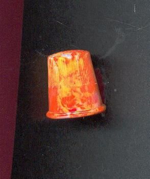 Mottled orange coloured plastic thimble with rolled rim. Wide plain band above. Knurling consists of rows of vertical lines to top,round over top. Inside apex U.S.A.9