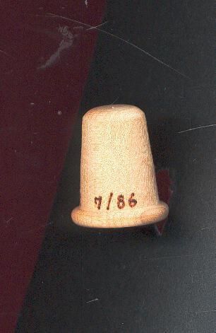 Plain wooden thimble with wide ledged rim. The name ÒEileenÓ and ÒR & RÓhave been burnt into the wood just above the rim