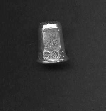 Silver thimble with rolled rim. Hand crafted. Design of CatherineÕs wheels above rim. Initials EA on body of thimble. Body is smooth but worked- hammered.Flat knurled top. Stamped on rim ED and 999.