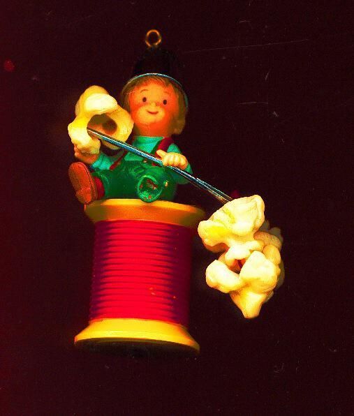 Novelty Christmas ornament thimble . Boy with metal silver coloured hat sitting on spool of thread with neeedle and thread, threading popcorn. Stamped 1986 Enesco Imports Corp. Colours mainly red, green and white.