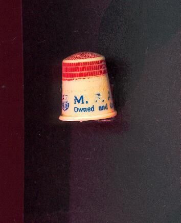Cream coloured early plastic Advertising thimble with red top. Advertising in blue print ÒM.F. A.Oil Co. Owned and Controlled By Farmers*Ó Inside apex B&B St. Paul.