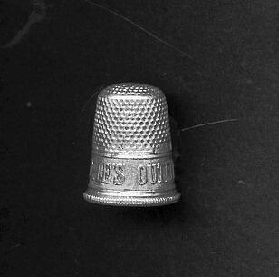 Aluminum Advertising thimble with rolled lined rim. Plain band above with advertising Ò*PeopleÕs Outfitting Co.Ó Stamped Austria in knurling above band. Dent near top, out of round.