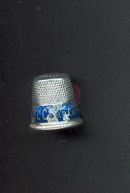 Aluminum Advertising thimble with rolled lined rim. Blue band above, mostly gone. Advertising Ò*Manhattan Oil CompanyÓ.