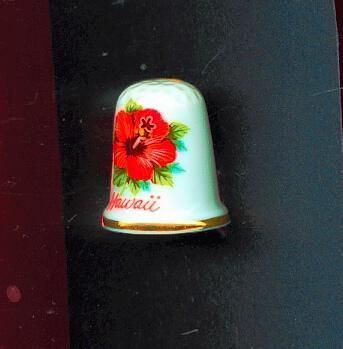 White glazed china Souvenir thimble with gold band at rim. Orange-red hibiscus flower on body of thimble with ÒHawaiiÓ below in red also. No marks. Faint signs of knurling on top.