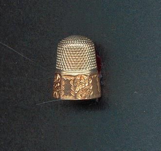 Silver thi,mble with gold panelled band. Alternating bands of pattern on the 10 panels. One panel acts as cartouche with size 9 and the fouled anchor of Goldsmith Stern. Knurling to and over top. Inside apex Sterling.